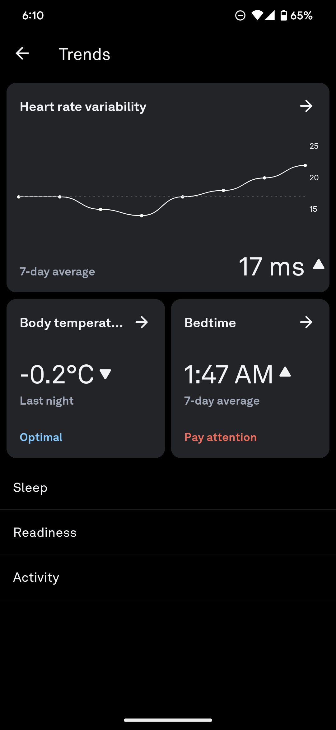 Oura should also allow us to customize the cards on the landing screen (remove, add, sort). If I’m tracking a specific metric, I have to go digging for it every day. There are some inconsistencies in how you swipe between days in different parts of the app, and in how you tap to expand and see more trends. Those are all minor details, but a bit more consistency and personalization would go a long way in making the app more user-friendly.