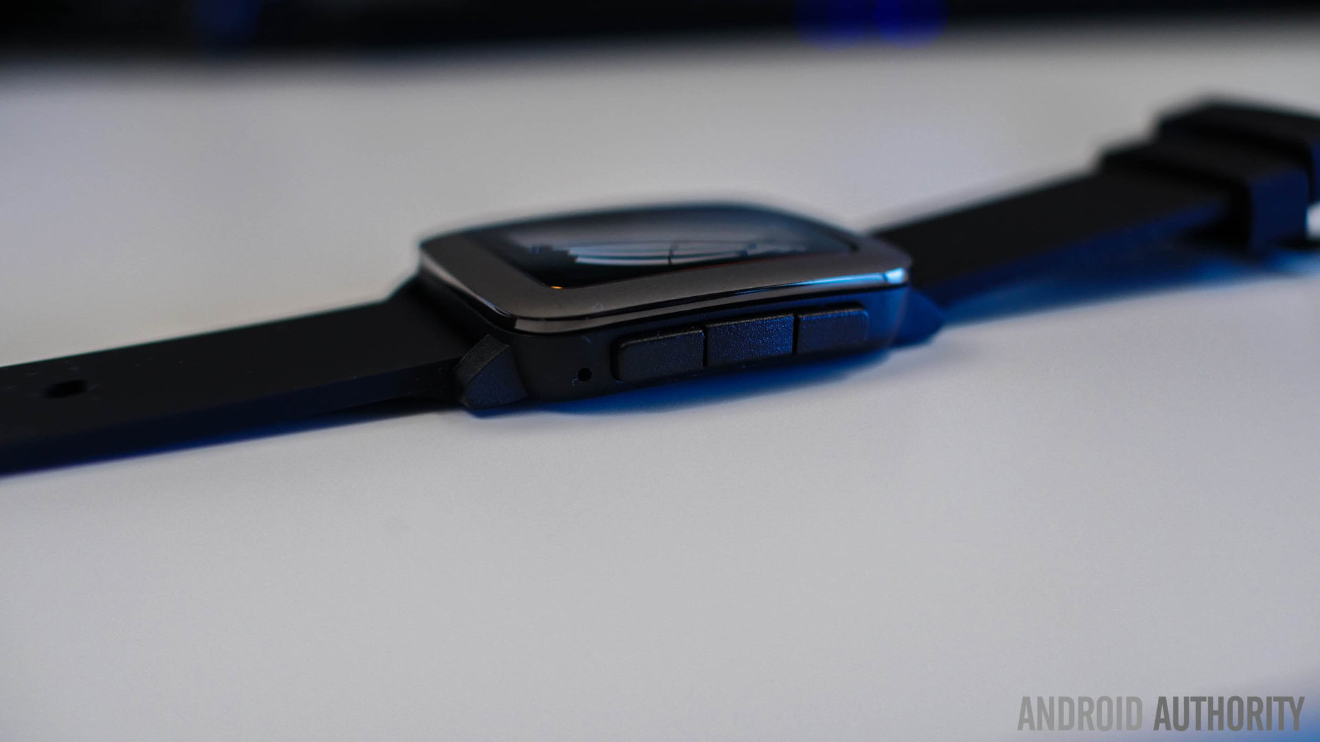 The sides of the body house the button layout, with the selection button flanked by the up and down navigation keys on the right, with a back button towards the top on the left side. A water resistant microphone is just below the buttons on the right, that can be used for any voice input. The buttons start off squishy, but end with a strong click at the end, and feel pretty sturdy all around. The availability and usage of the buttons is one of the main differences between Pebble devices and the other smartwatches out there, with Pebble still favoring this implementation over complete touchscreen control.