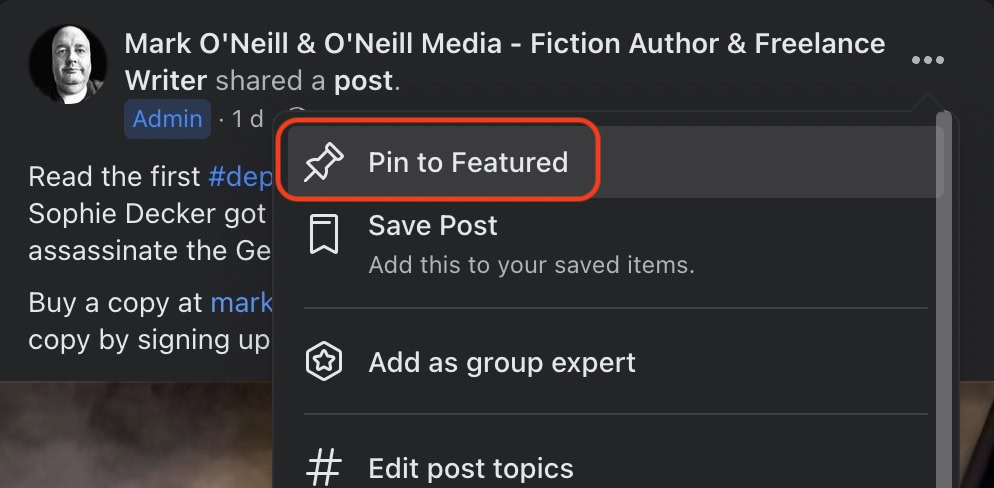 You can pin a post on your profile, a business page, or a group. Obviously, the business page and the group have to belong to you to be able to pin anything (or the owner has to make you a page administrator). The position of the pin option, and the wording in the menu, differ slightly depending on where you are pinning something.