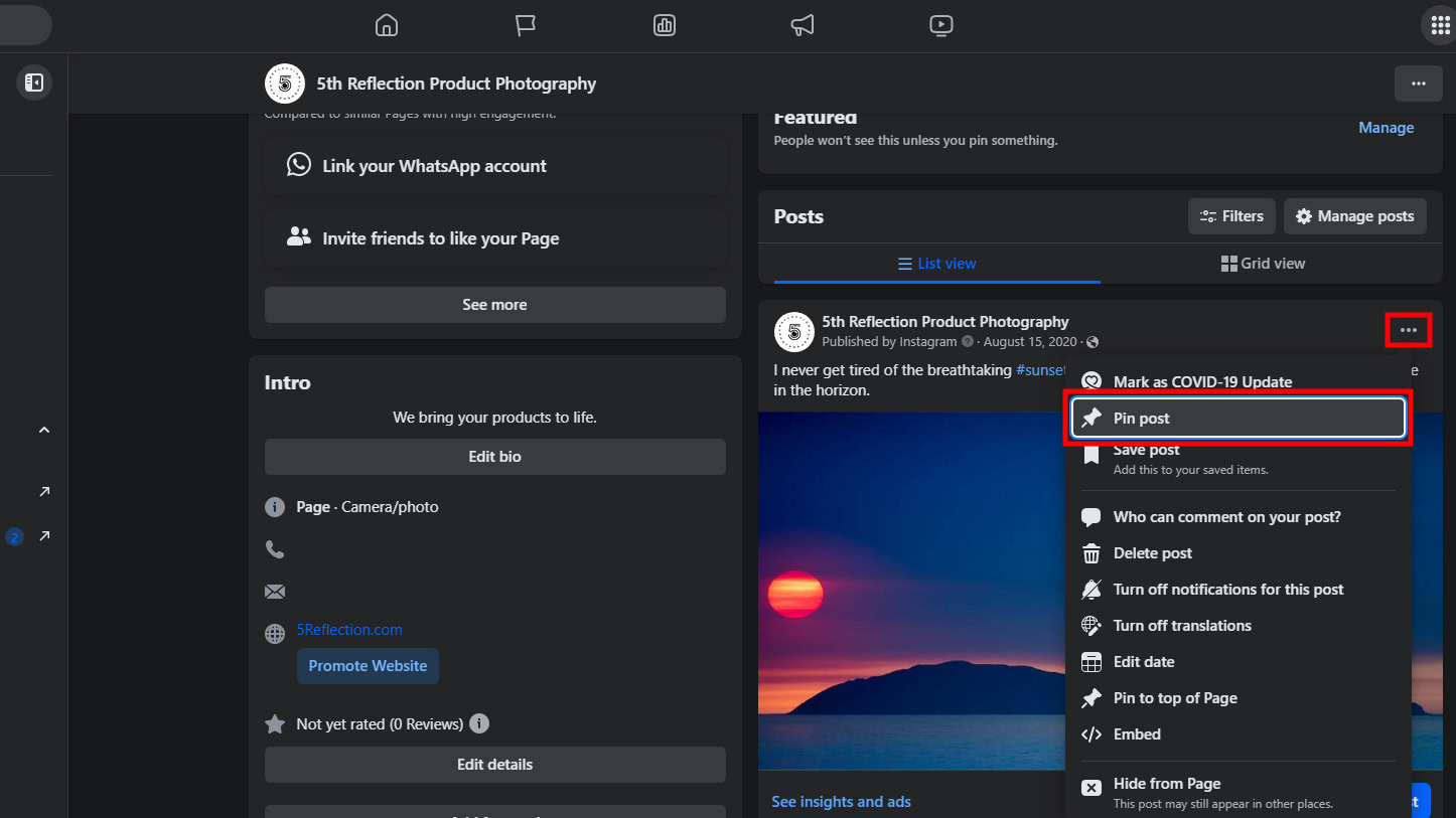 To pin a post on Facebook, publish the post first. Then go to your profile page, find the post, and click the three horizontal dots on the top-right. The first option will be Pin post. Select that, and the post will remain at the top of the page until unpinned.