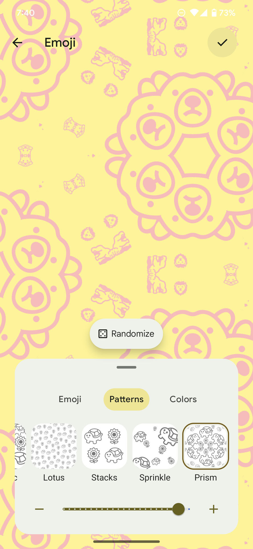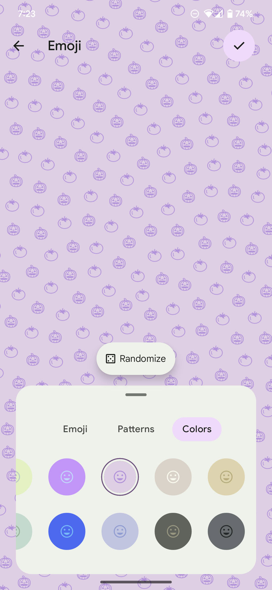 The easiest way to create some new and original wallpaper mashups is to tap on that Randomize button. This will do it all for you: select a new mix of emojis (usually thematically linked), pick a color, assign a pattern, and choose its size. The results are unlike any traditional Android wallpaper.