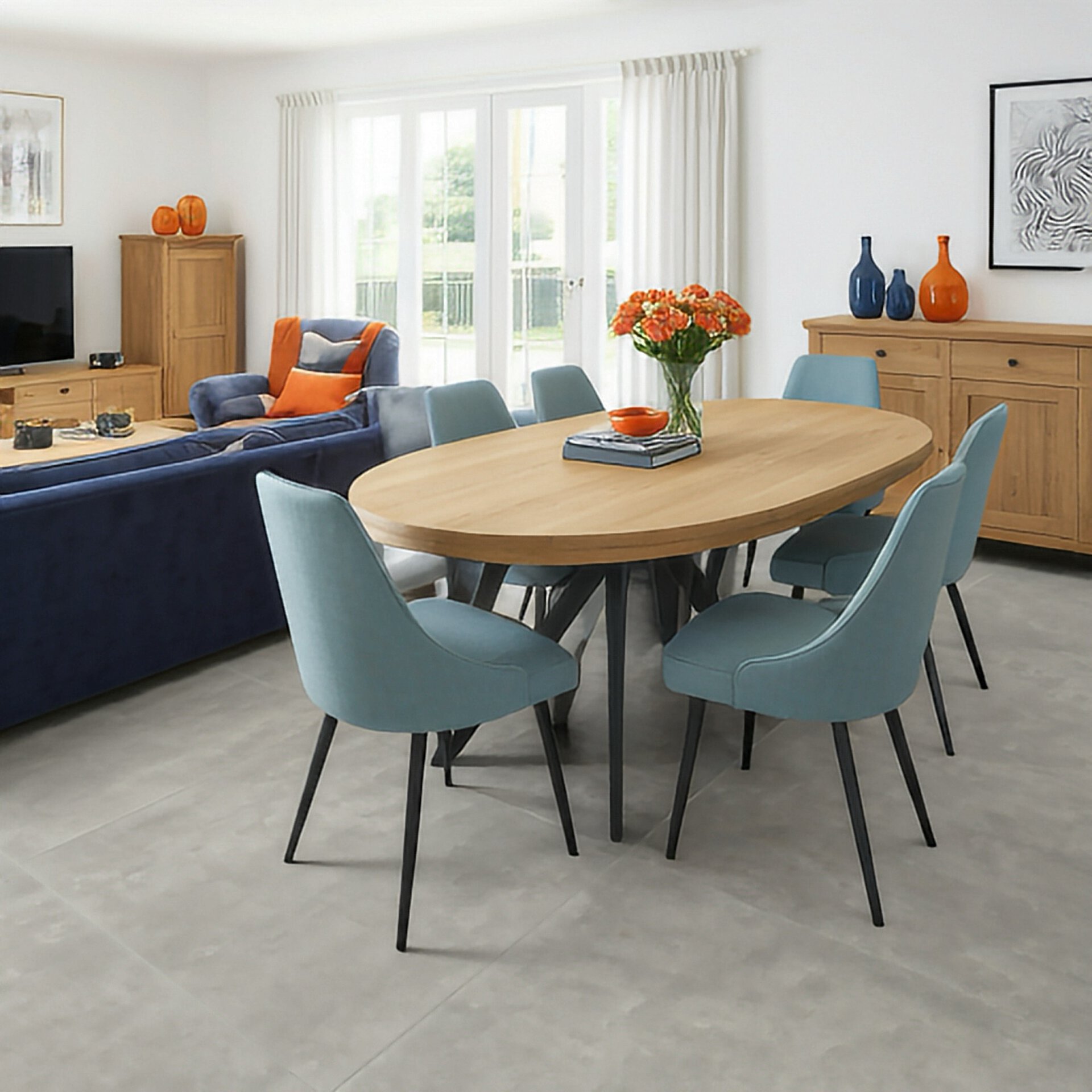 Then, we started tweaking the prompt to see how green, yellow, red, and orange would fit in with that kind of space. And when we bought an oak dining table with light grey chairs, I added those to the Pixel Studio prompt, too, to see how well they integrated with the rest of the elements.