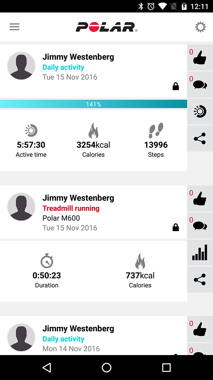 The app is divided up into three main sections: Feed, Activity and Training. The first section, Feed, is basically a timeline of your daily activity, which displays a snapshot of your activity statistics for each day. You’ll be able to see your total active time, calories burned and total steps taken. And if you connect with friends, you’ll be able to see, comment on and thumbs up their activity.