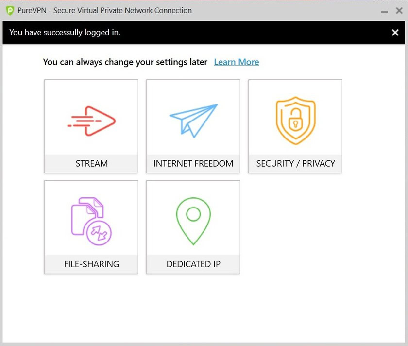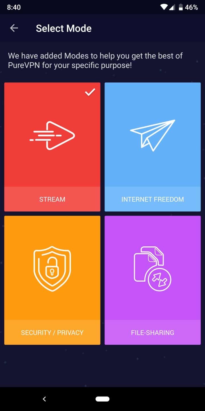 You will first have to select a “mode” to get started. These modes include Stream, Internet Freedom, Security/Privacy, File Sharing, and Dedicated IP (which requires an add-on service). You select the mode you want based on how you want to use the VPN. The mode can always be changed in the Settings menu later on.
