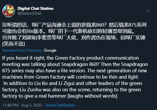 “If I didn’t hear incorrectly, the Snapdragon 860 was discussed during OPPO’s communication event,” said Digital Chat Station in a tweet we asked a native speaker to translate (you can see the Google Translate version below). “The Snapdragon 875 series could also have ‘lite’ versions.”