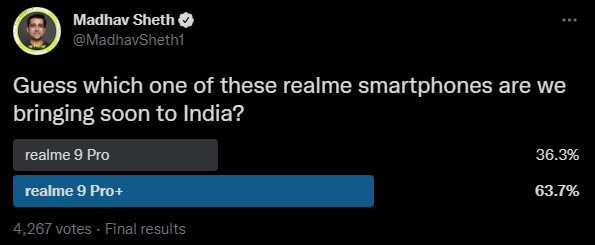 realme vice-president Madhav Sheth posted a poll on Twitter yesterday, asking users to guess which realme smartphone is coming to India “soon.” The poll answers are either the realme 9 Pro or the realme 9 Pro Plus.