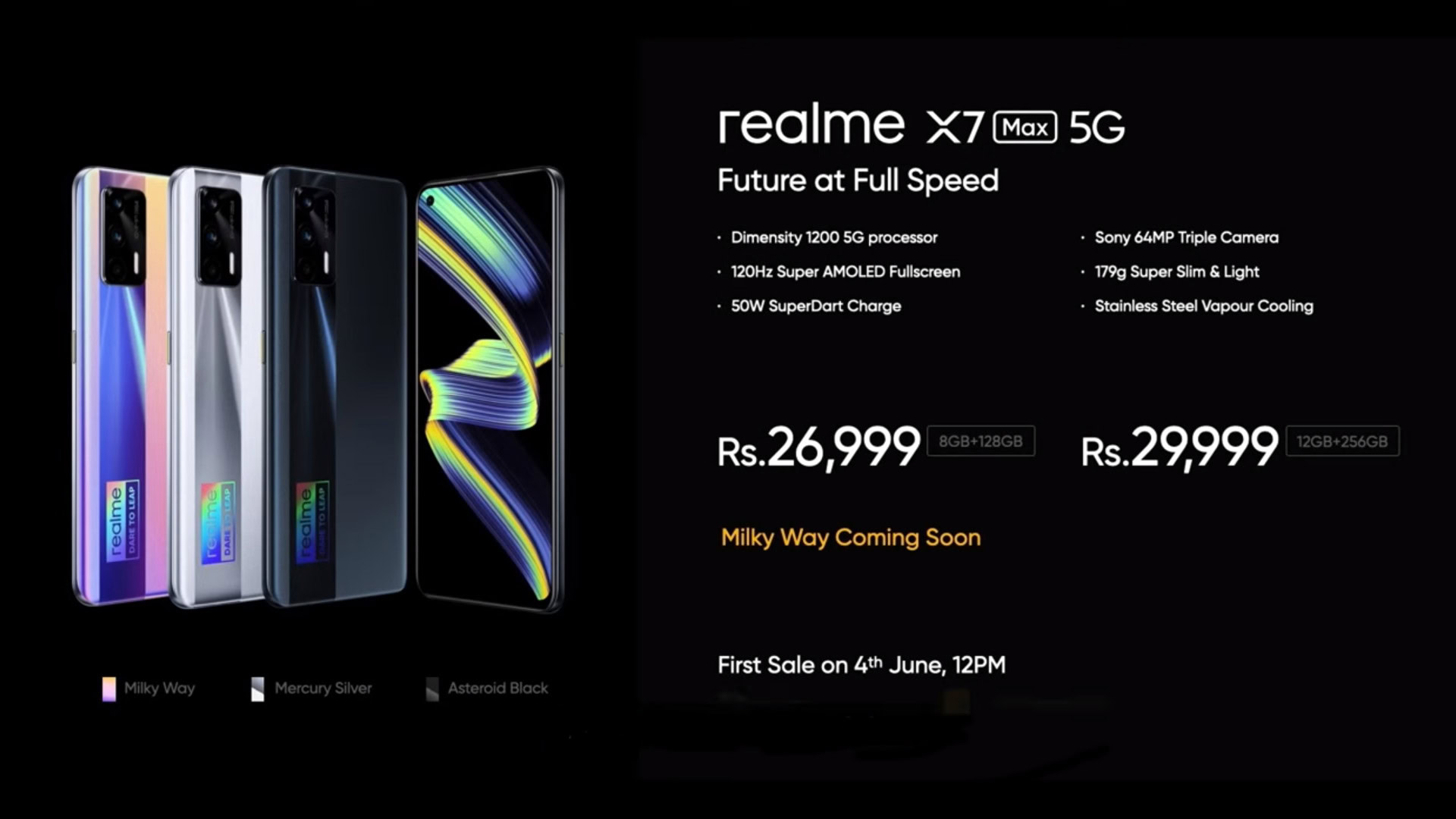The realme X7 Max 5G will be priced at Rs 26,999 (~$372) for the 8GB/128GB variant, while the 12GB/256GB model will set you back Rs 29,999 (~$414). Expect to find the phone in Asteroid Black, Mercury Silver, and Milky Way colorways.