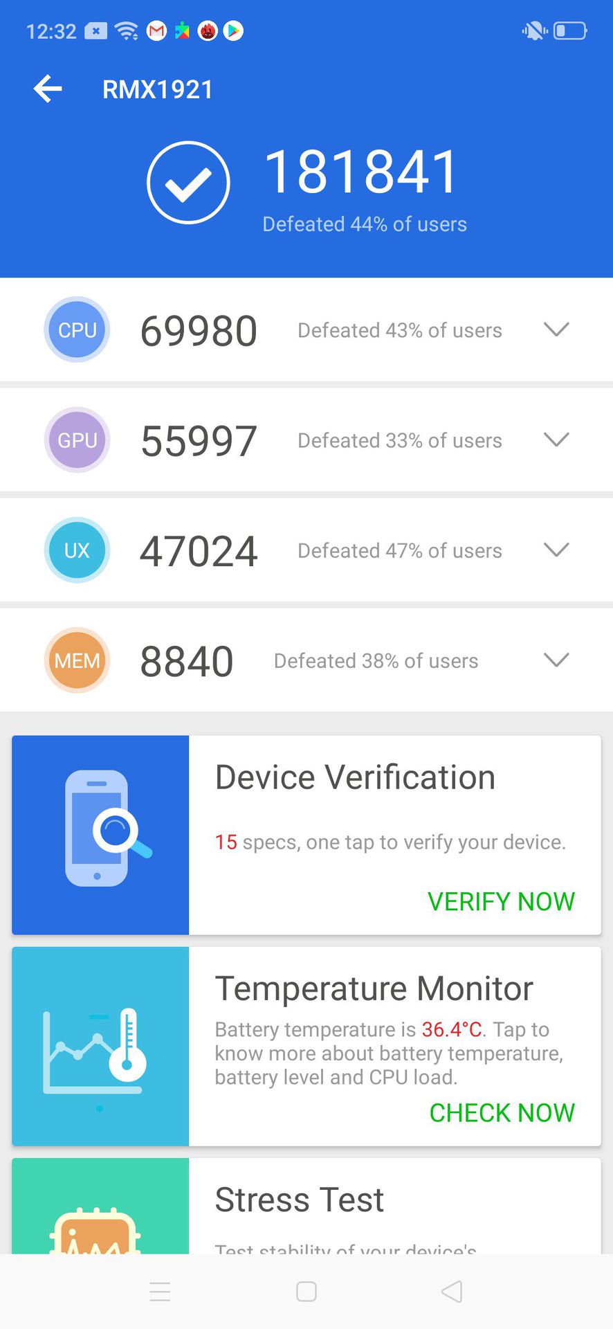 In terms of benchmarks, the phone comes very close to similar hardware by vivo. The realme XT managed 181,841 points in the CPU-focussed AnTuTu benchmark. This was about 3,000 points short of the 185,123 score of the vivo Z1x. The 3DMark scores were closer at 2,095 points on the realme XT vs the 2,100 of the vivo Z1x. Similarly, the Basemark scores showed a noticeable difference.
