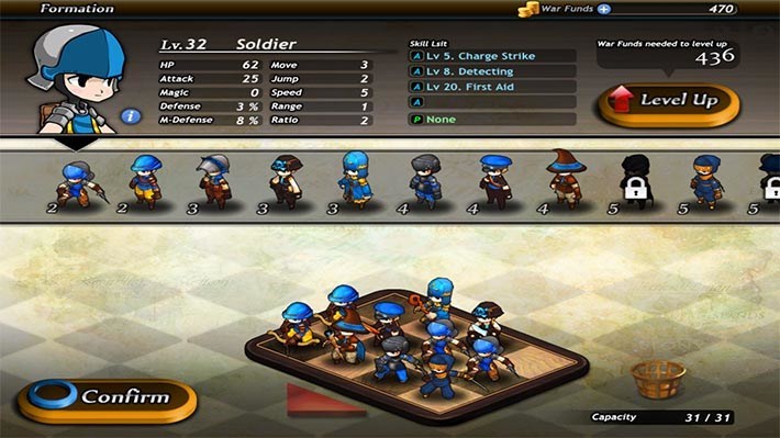 Much like any other strategy RPG, you play as a group of characters who take to the battle field against a group of bad guys. You must strategically move your characters and attack the bad guys. The graphics are cleverly done 2D and the style of the graphics may very well lend to the notion that this is a Final Fantasy Tactics clone. There are 26 classes you can choose from and the game boasts over 1000 stages although we wouldn’t be surprised if many of those elements were recycled. Regardless, it’s a very long game.