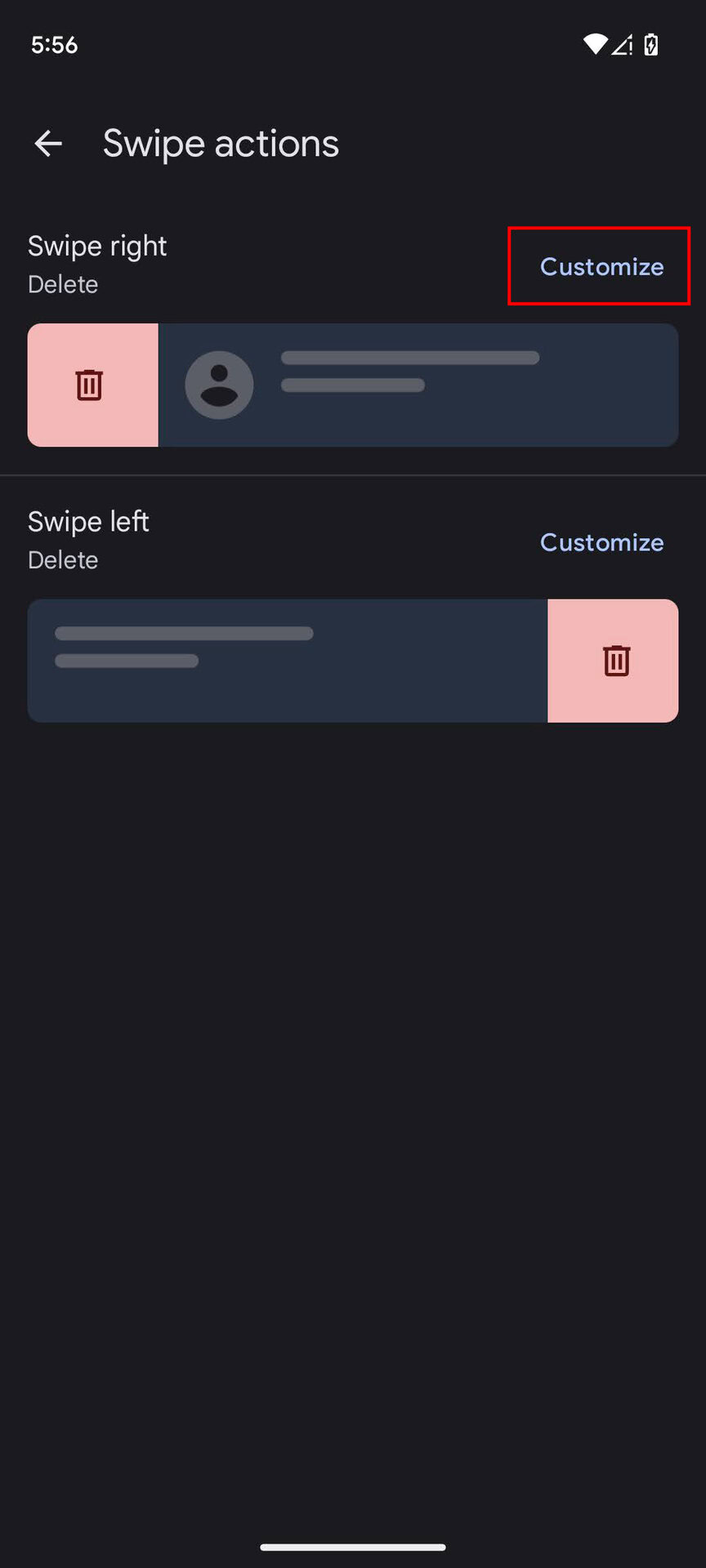 - Select Customize next to either Swipe right or Swipe left. You can change both, too, to ensure you don’t accidentally delete any text using the swipe actions.