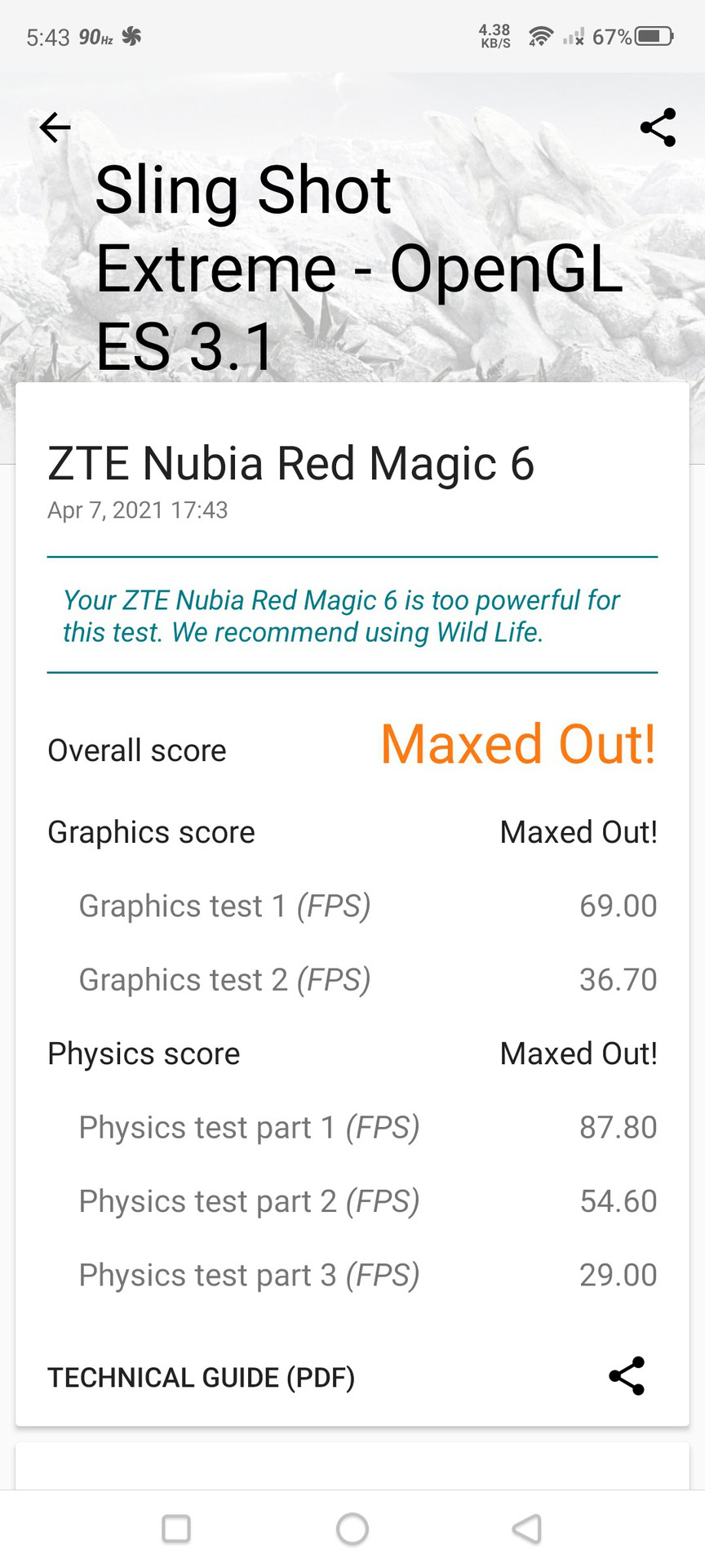 For those who like benchmarks numbers, the REDMAGIC 6 maxed out the Sling Shot Extreme test in 3DMark with the app reporting that the “REDMAGIC 6 is too powerful for this test,” though this is common across Snapdragon 888-powered devices. 3D Mark’s latest test is called Wild Life. The REDMAGIC 6 scored 5,743 with an average frame rate of 34.4fps. For context, those are very similar scores to the OnePlus 9 and the Samsung Galaxy S21.