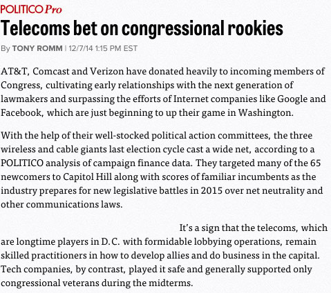 A year later, another group of Republicans, including Thune, introduced a new bill titled the “Freedom for Consumer Choice Act (FCC Act),” which was essentially written by AT&T. As TechDirt noted at the time, AT&T was the top contributor to most of the politicians involved in the bill and the few politicians who didn’t have AT&T’s donor support in past year suddenly saw AT&T appear on their list of top contributors.