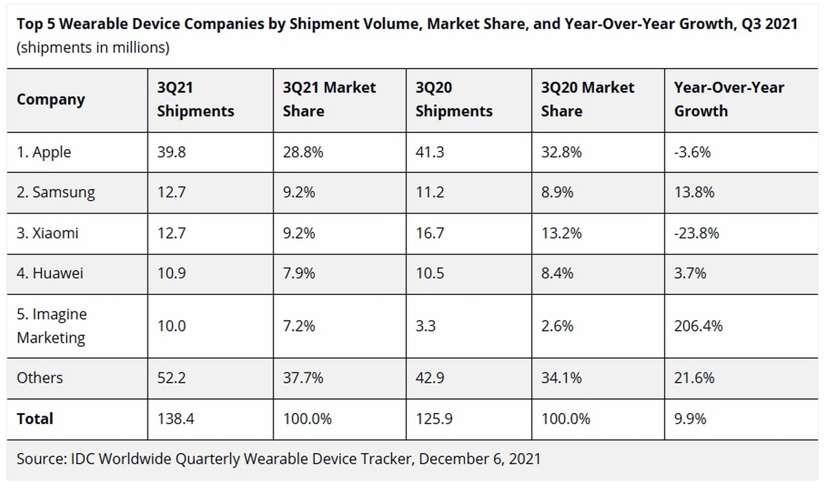 - According to IDC, global wearable and audio shipments grew slightly in Q3 2021.