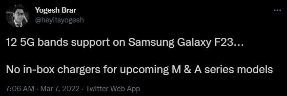 Frequent tipster Yogesh Brar has claimed on Twitter that Samsung won’t offer in-box chargers for upcoming Galaxy M and Galaxy A series smartphones. Furthermore, Brar added that the upcoming Galaxy F23 will lack a charger too.