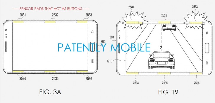 Samsung’s patent application suggests that the sensor pads could be used to control various smartphone functions. Photography options seems like an avenue that the researchers were particularly keen to explore, moving the buttons off-screen and allowing users to take a picture, start a timer or switch to video by pressing on a part around the edge of their display. Options could also be moved around to best suit the user’s preference.