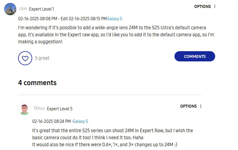 The Expert RAW app lets Galaxy S24 and S25 series owners shoot 24MP photos via the main camera. However, a Samsung representative on the company’s Korean Community forum has confirmed that the brand is looking at bringing this feature into the main camera app. This comes after several users on the forum asked Samsung to offer a 24MP mode in the default camera app.