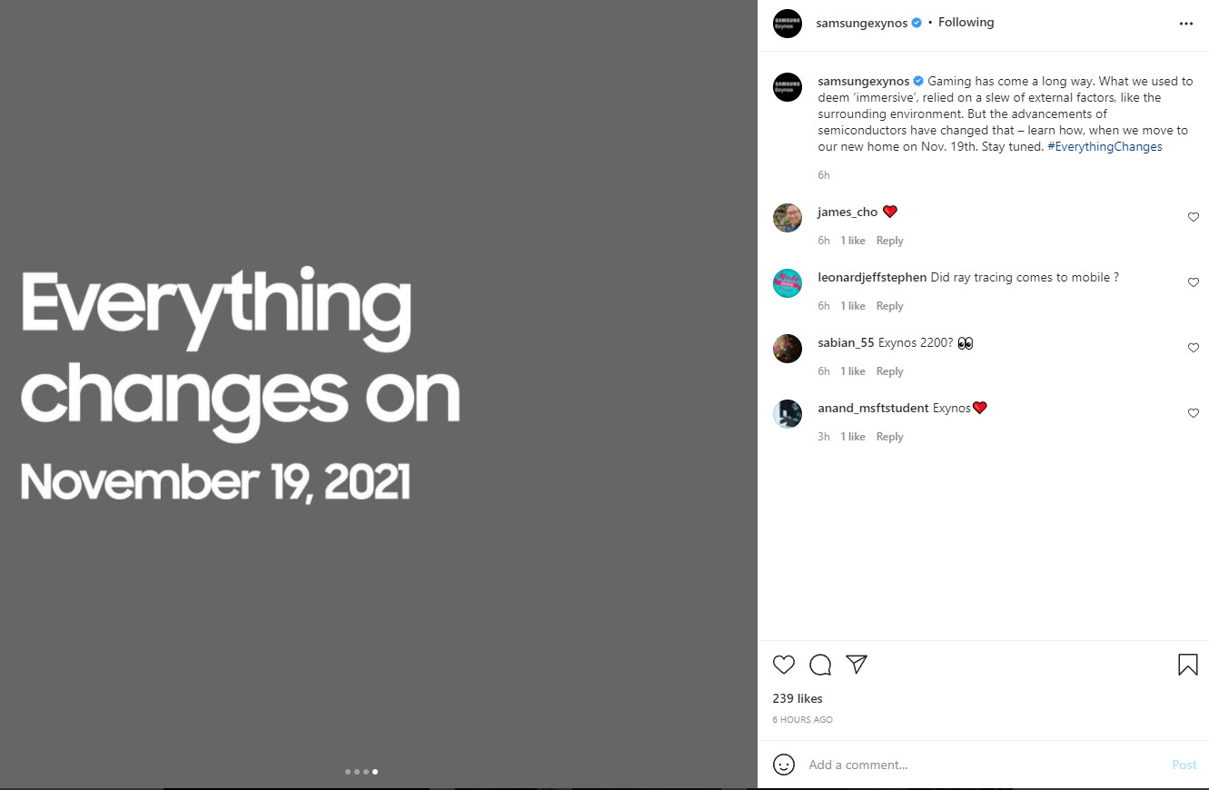 “With gaming graphics continuing to evolve, let’s show you what entertainment will look like in the future,” read an excerpt from a teaser posted on the Samsung Exynos Instagram account. The teaser further claims that “everything changes on November 19, 2021.”