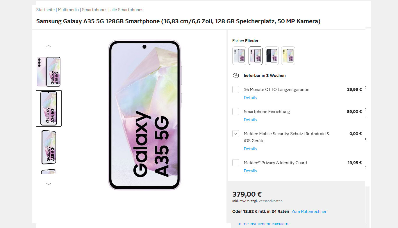 German retail chain Otto (h/t: WinFuture journalist Roland Quandt) has posted product listings for the Galaxy A35 and Galaxy A55. Starting with the cheaper device, the A35 is listed at €379 (~$413) for the 6GB/128GB base model. Expect to pay €449 (~$489) for the 8GB/256GB variant.