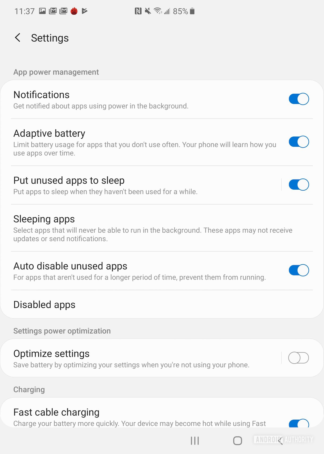 The phone’s 4,380mAh battery is actually split in two, with a portion residing in each half of the phone. Like the Note 10 series, the Fold relies on Samsung’s Intelligent Adaptive Power Saving Mode to keep the phone up and running. That means the device pays attention to how you use it over time and makes proactive changes to maintain a charge.