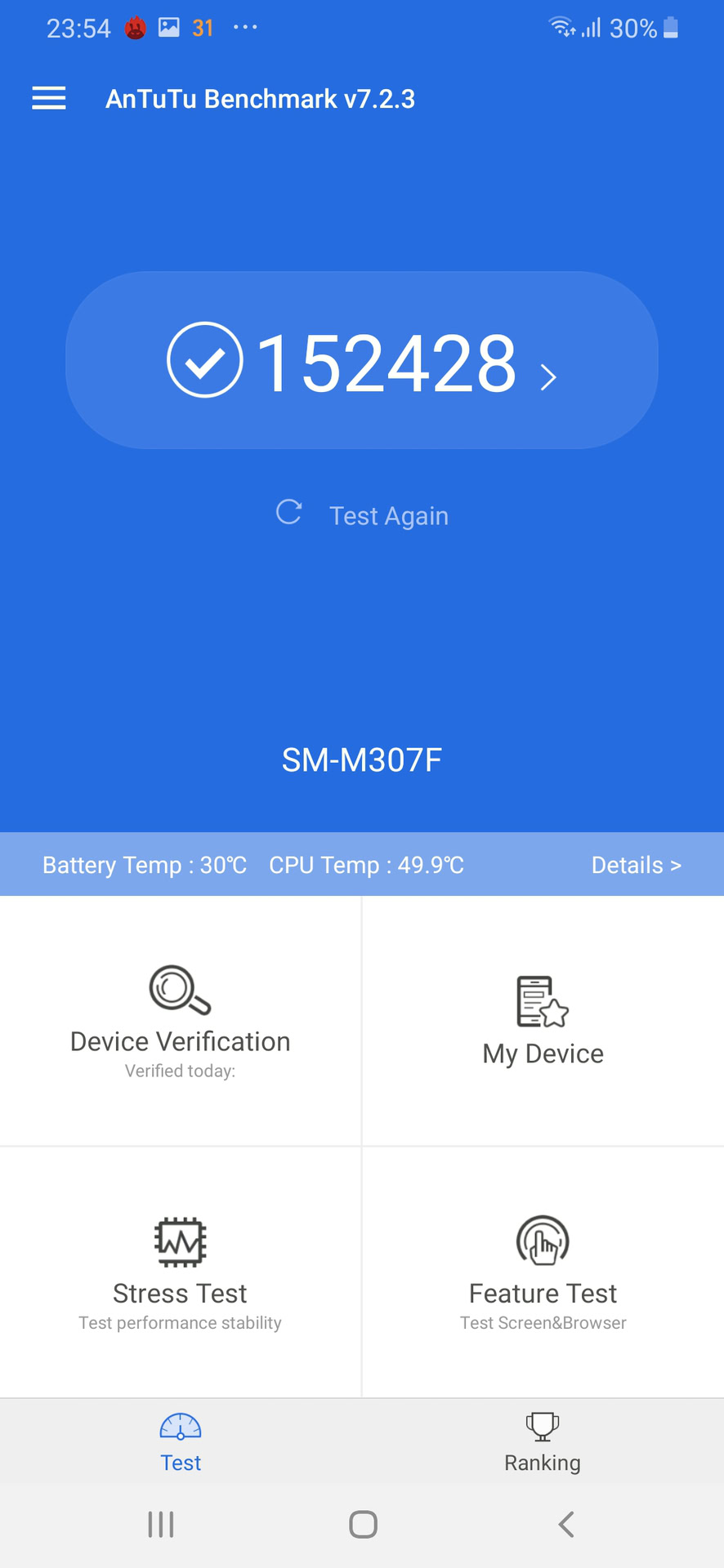 Benchmark tests show that the performance is similar to the Qualcomm Snapdragon 660 chipset. In AnTuTu, the phone scores 152,428 points. Meanwhile, the single-core and multi-core Geekbench scores for the Galaxy M30s were 1,674 and 5,329 respectively. This is within spitting distance of the 1,636 and 5,421 scores that we saw on the Redmi Note 7S sporting a Snapdragon 660 chipset.