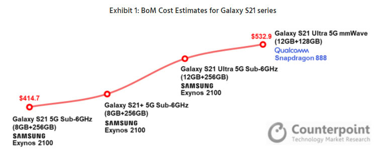 The Galaxy S21 and S21 Plus saw further cost savings of roughly 12% and 13% respectively over their predecessors. More specifically, Counterpoint found that a 256GB Galaxy S21 (Exynos 2100) had a BoM cost of ~$414.