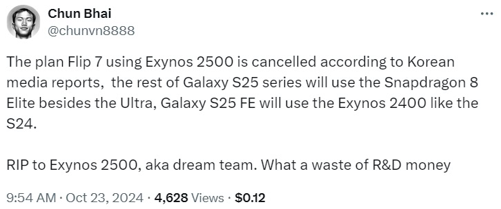 The Galaxy S25 FE is said to use the Exynos 2400 like the Galaxy S24. The Exynos 2500 is said not to be featured on this device or the Galaxy Z Flip 7, which is expected for later in 2025.