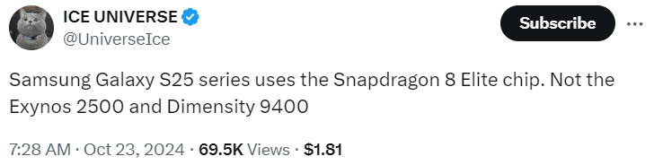 Leaker Ice Universe claims the upcoming Galaxy S25 series will use the Snapdragon 8 Elite chip and skip out on the Exynos 2500 and Dimensity 9400.