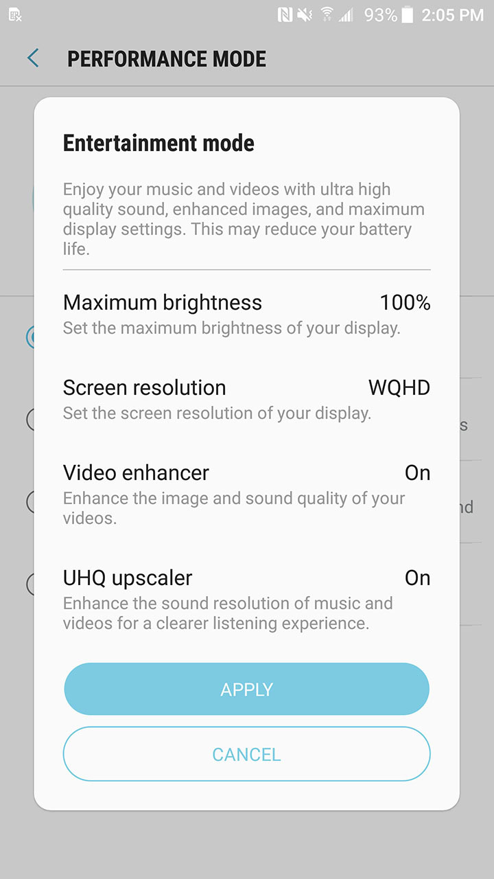 Depending on which mode you select, your phone’s settings will change to better cater to that profile. For instance, choosing Entertainment mode will result in your display increasing to 100% brightness, your screen resolution increasing to WQHD, and your video enhancer and UHQ upscaler being turned on.