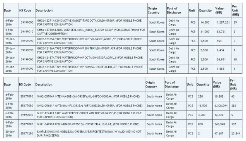 Samsung assembles its devices locally in India, so the import tracking data for a “waterproof SIM tray”, “waterproof mic” and “conductive gasket tape” certainly point to a water-resistant Galaxy S7. Rumors have already indicated an IP67 rating (dustproof and water-resistant up to one meter for up to half an hour). IP67 is the same rating found on the Galaxy S5, although it had a waterproof flap over its USB 3.0 port.