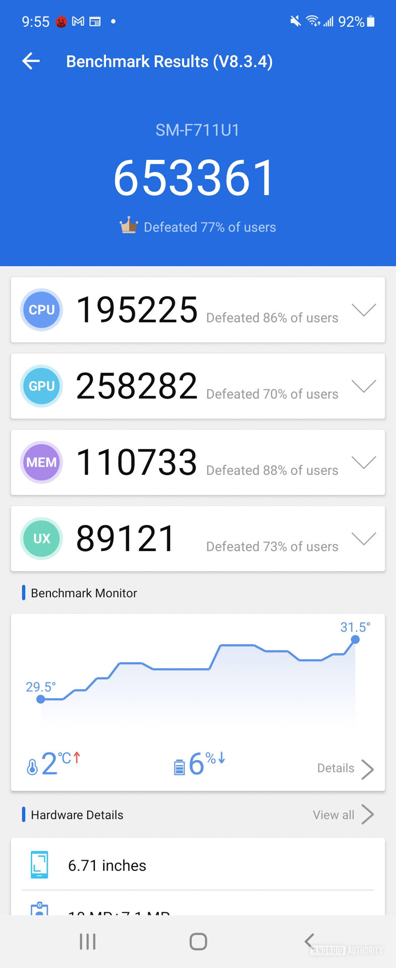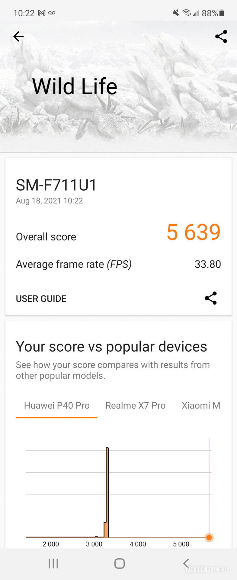 The Z Flip 3 put up nearly identical benchmark scores as the Z Fold 3, which meant it did well on CPU tests but was a little slower when the GPU was rated. It’s still well within the margin of 2021’s best devices, though it falls short of the phones we’ve seen so far in 2022. The Z Flip 3 managed to best a few phones on Android Authority‘s homegrown Speed Test G benchmark, which it ran in one minute 18 seconds. That’s quicker than the Galaxy S21 did with the same processor.