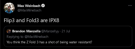 While answering a tweet, Weinbach suggests that both phones will feature an IPX8 rating, bringing the niche devices more in line with Samsung’s traditional flagships than ever before. This also corroborates a previous rumor from April.