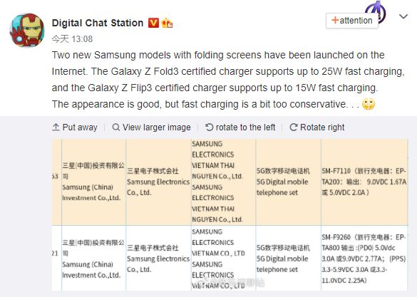 - Samsung’s Galaxy Z Flip 3 and Galaxy Z Fold 3 charger specs have emerged.