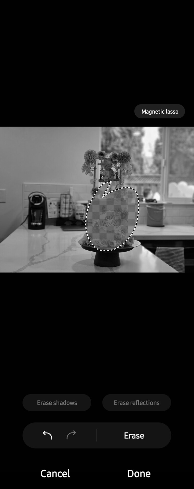 Automatic object detection often lacked accuracy, while manual outlining was challenging to execute precisely on a touch screen. The Magnetic Lasso function simplifies object selection. Users can draw a rough outline around the object they want to remove. Once the outline is complete, the selection automatically adjusts itself to adhere to the object’s edges, ensuring a precise selection.