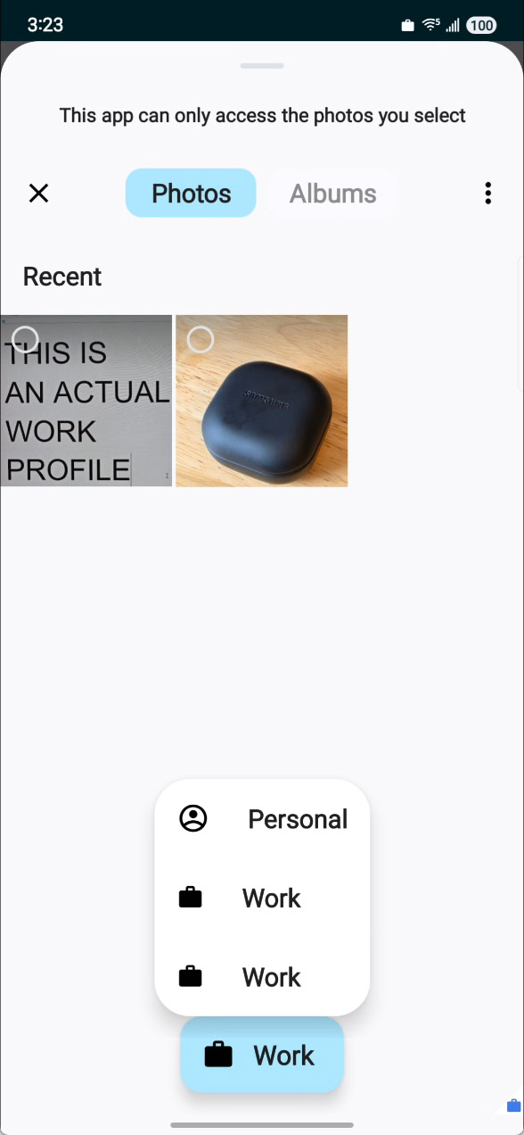 Reddit user lawyerz88 recently discovered a method to access photos and videos saved in the Secure Folder. Normally, if you launch an app that asks you to insert a photo or video using the Android photo picker, Android will block access to items stored in the Secure Folder, even if it’s unlocked. However, this is only the case if you try to access Secure Folder items from a “personal” app, i.e., an app running in the main profile. If you try to access Secure Folder items from a “work” app, though, then Android doesn’t block access.