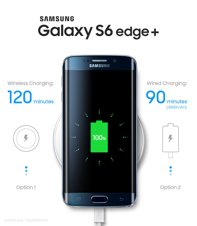 The charging improvements in the new smartphones are not just limited to the wired charger as Samsung has also introduced a new much faster wireless charging pad. Using the new charging pad, the Galaxy Note 5 and Galaxy S6 Edge+ can charge to full in just 2 hours, which is much faster than the S6 Edge, which takes three hours to charge to full with a wireless charging. If the Galaxy S6 Edge+ had the same battery size as the S6 Edge, it would take just 104 minutes to charge to full wirelessly, which is approximately 43 percent faster than the current S6 Edge wireless charging speeds.
