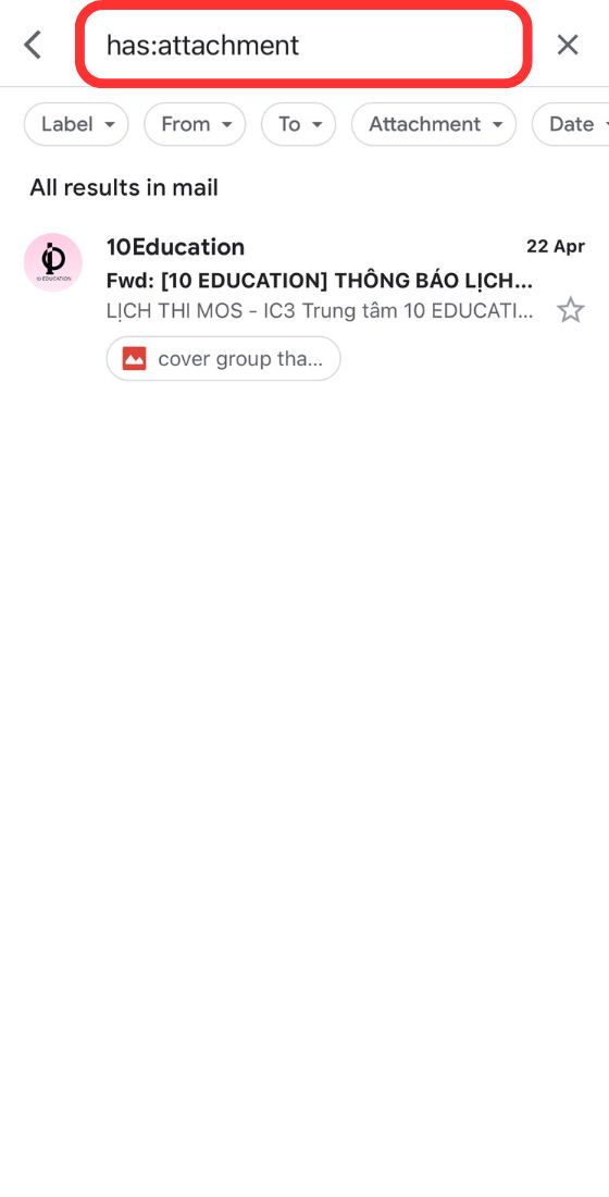 has:attachmentin the search bar. Make sure there are no spaces between “has:” and “attachment”. - Tap on the magnifying glass icon or hit enter on your keyboard to initiate the search.