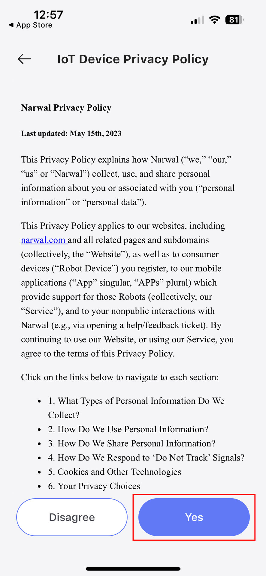 - Go back to the Narwal Freo app and enter the verification code. Make sure both disclaimers on the bottom are checked, then hit Login/Register.