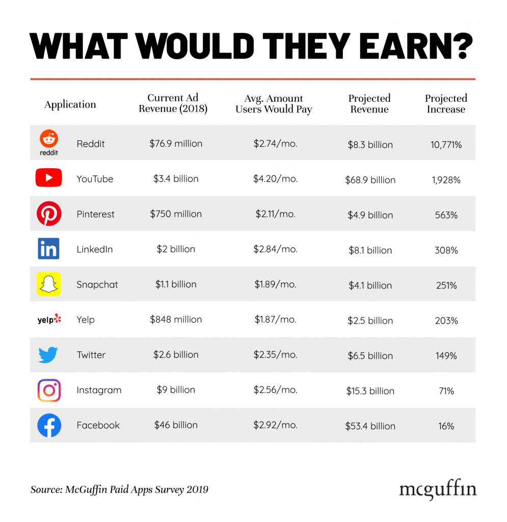 Although the chart above is interesting, things get really interesting when you extrapolate how much a company could earn if it adopted the paid model rather than the free model we see from these major services. In the case of Reddit, it could potentially make 10 times its current yearly revenue if it charged for the service.