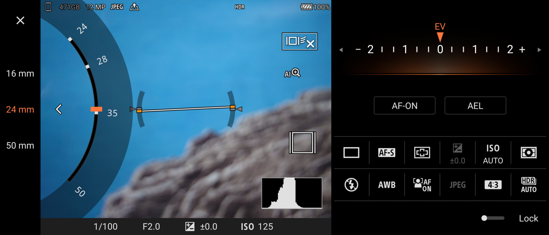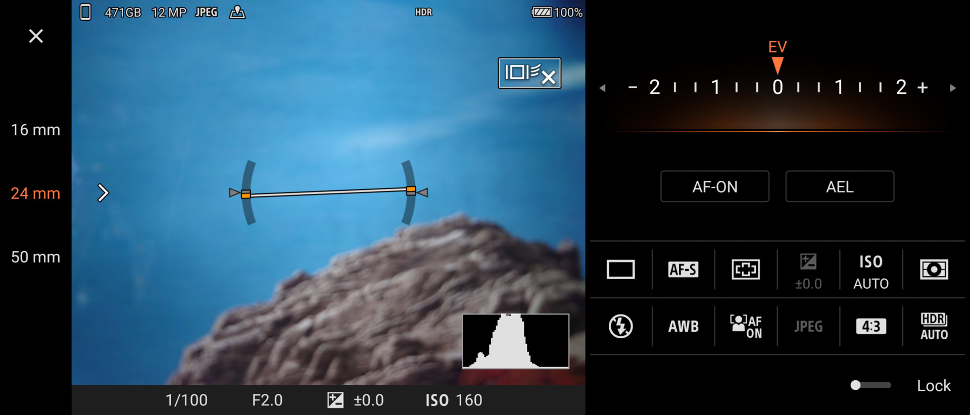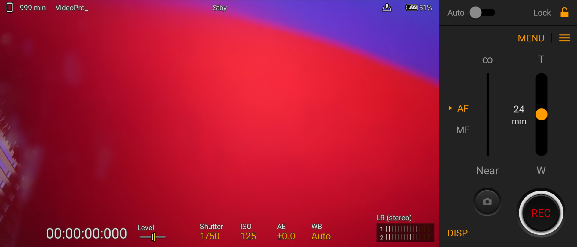 Pros can shift gears to put the Pro-I’s powers to real use. Using a spinning software dial similar to a real camera’s mode selector, the app includes options for auto, program, shutter priority, and manual. Selecting any of these calls up a Sony Alpha camera-inspired menu that populates the right side of the screen (see above) where you can take total control over ISO, brightness, focus parameters, metering, white balance, and the like. These are advanced functions that take some know-how to use properly.