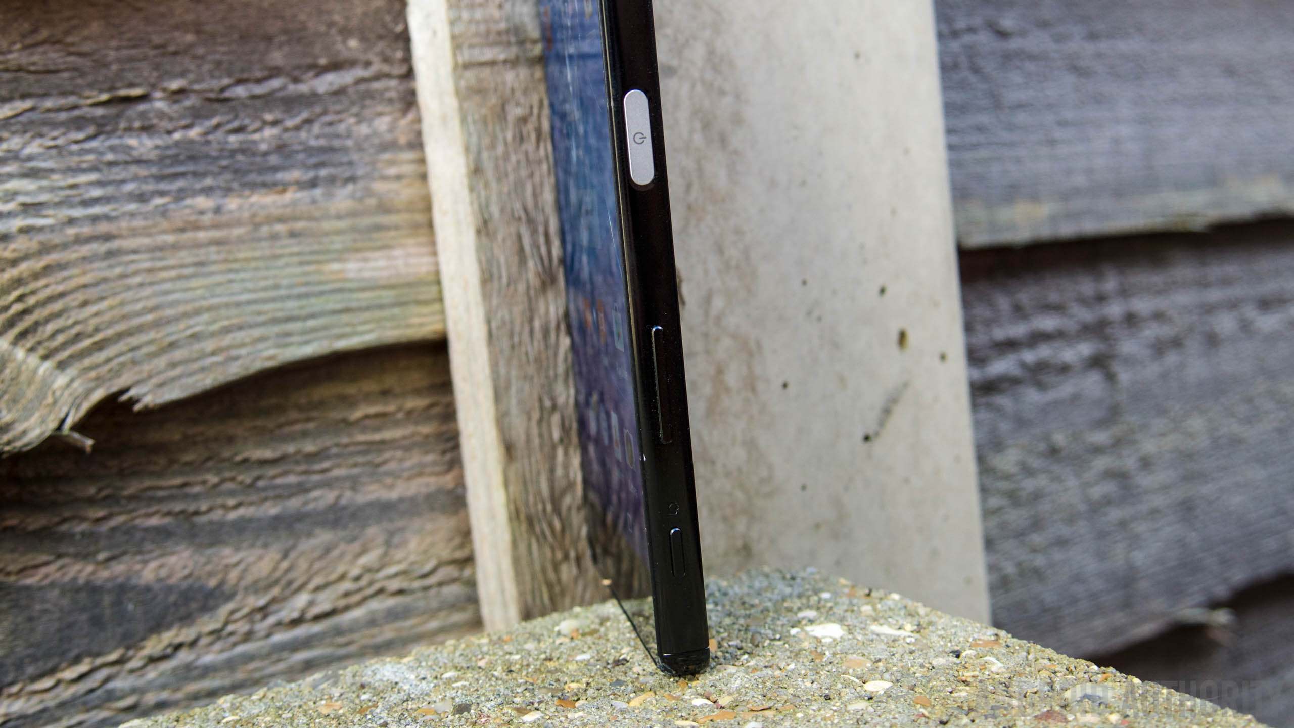 On the right-hand side we can find all the buttons. Sony sure found a way to pack as much as possible on the bottom half of one edge of the phone, but that effort proved to be worthless, at least if you have big hands. Maneuvering the device can prove difficult in this case. Not only is there a dedicated camera button and volume rocker, there’s also the now larger power button that has a fingerprint sensor hidden inside of it.
