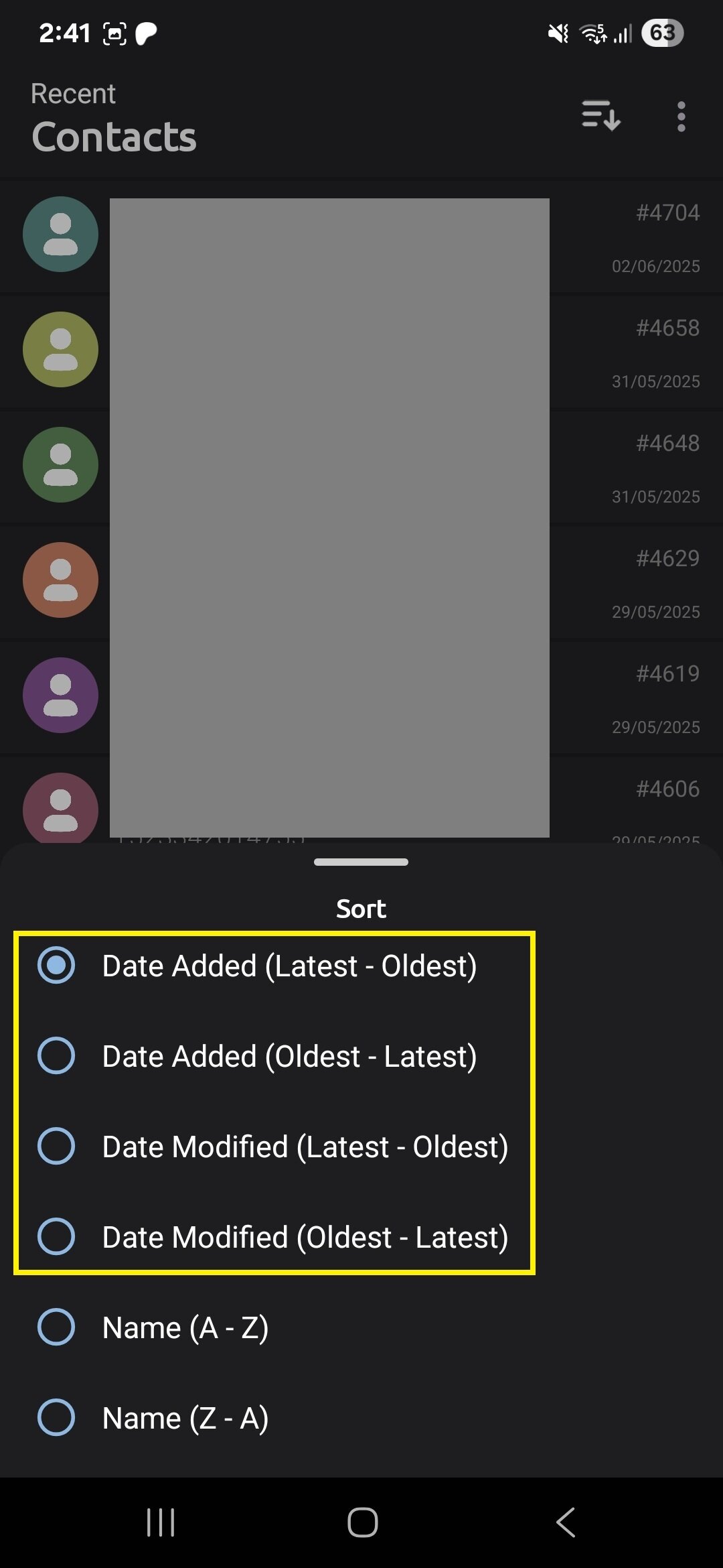 - Your contacts should already be ordered by date added (latest to oldest). If not, hit the Sort icon at the top right, with the same icon image as in Quis.