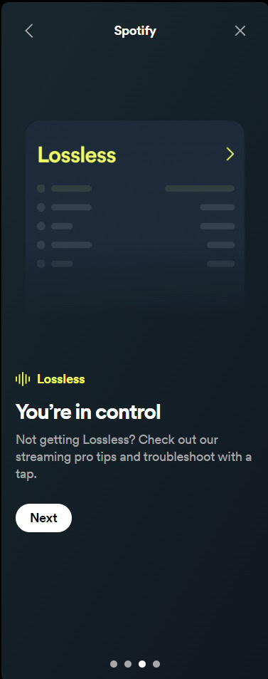 The next set of screenshots are from the feature introduction screen on the mobile app. The prompts say you can stream wirelessly in “up to 24-bit” on compatible devices through Spotify Connect. A “Lossless” label will indicate when you are streaming lossless music.