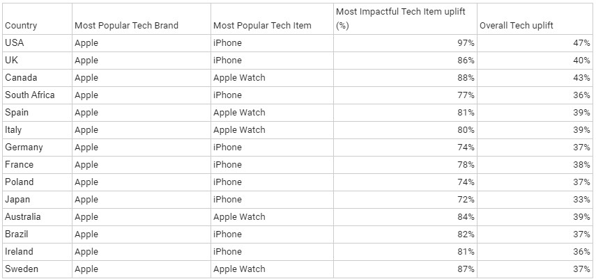 MoneySuperMarket also shared a country-by-country breakdown with Android Authority, showing the top tech item for matches in each market as well as the corresponding boost. Unsurprisingly, the US preferred the iPhone, with its 97% uplift in matches leaving other markets far behind. The breakdown also shows the average of all tech brands that displayed improvements in match rates. Check it out below.