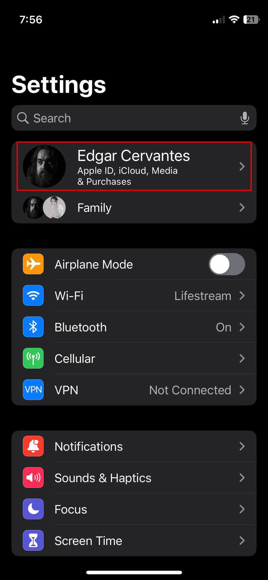 - Go into your Apple ID settings, labeled as your name.