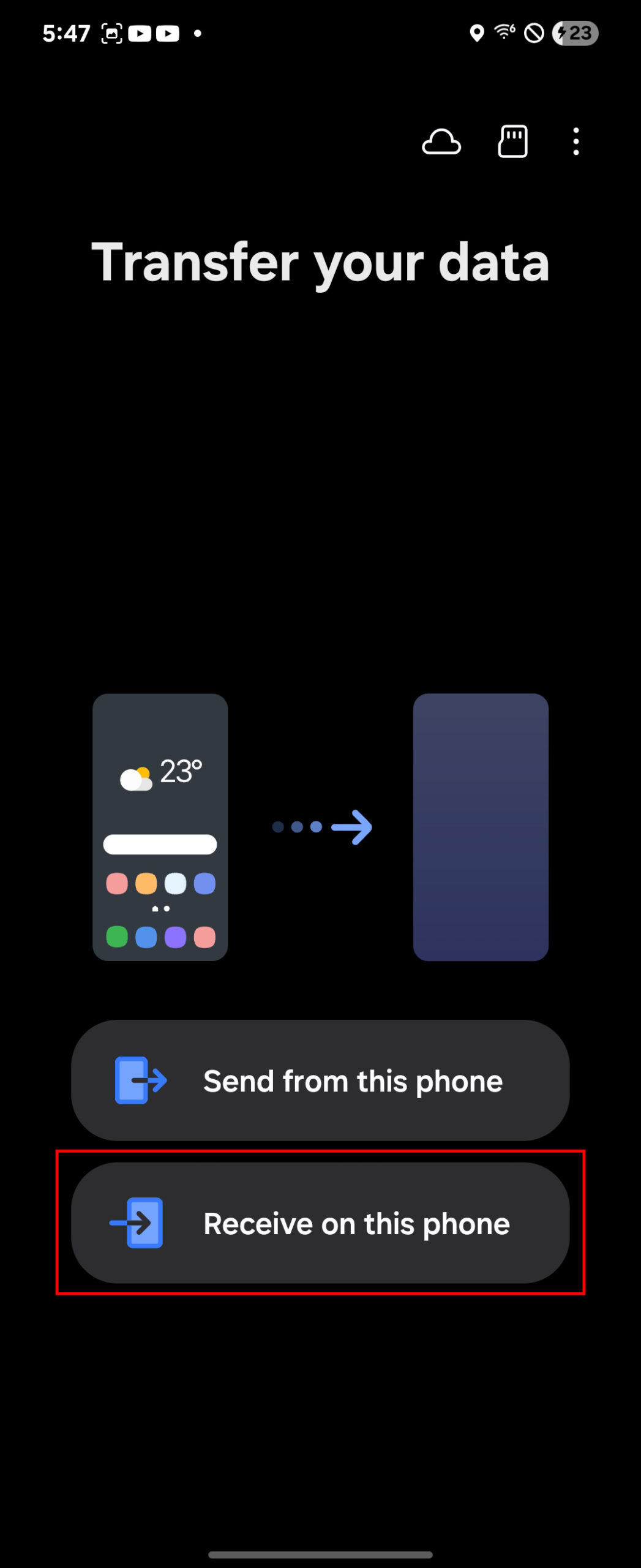 - Once you get to the Transfer your data screen, select Receive on this phone.