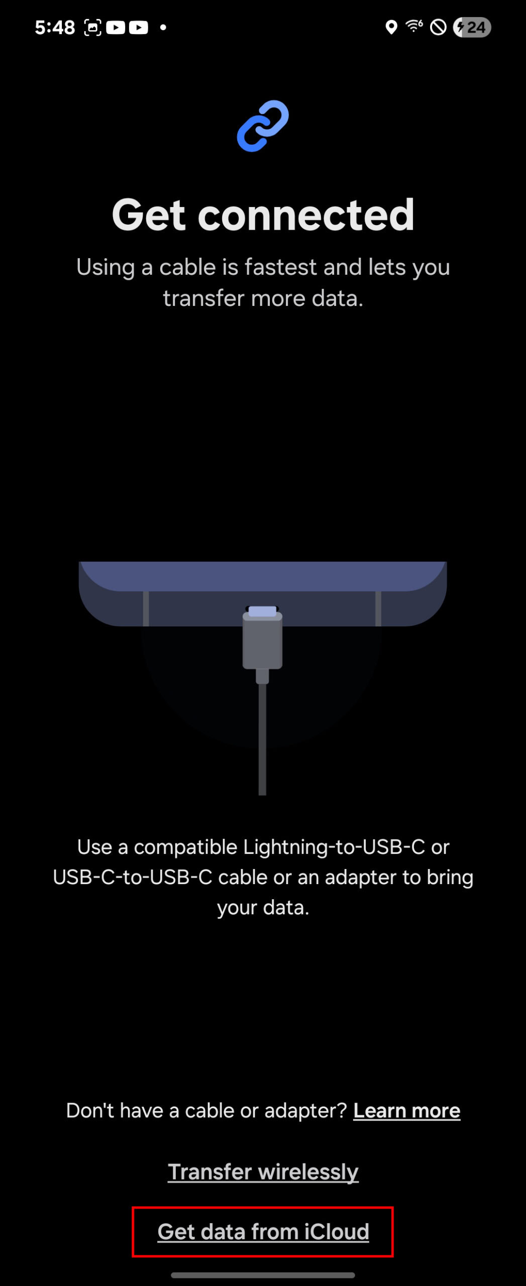 - You’ll get the option to transfer the data wired, which would be more reliable and faster. That said, we like the Get data from iCloud option just because it seems more convenient, especially if you already have everything backed up.