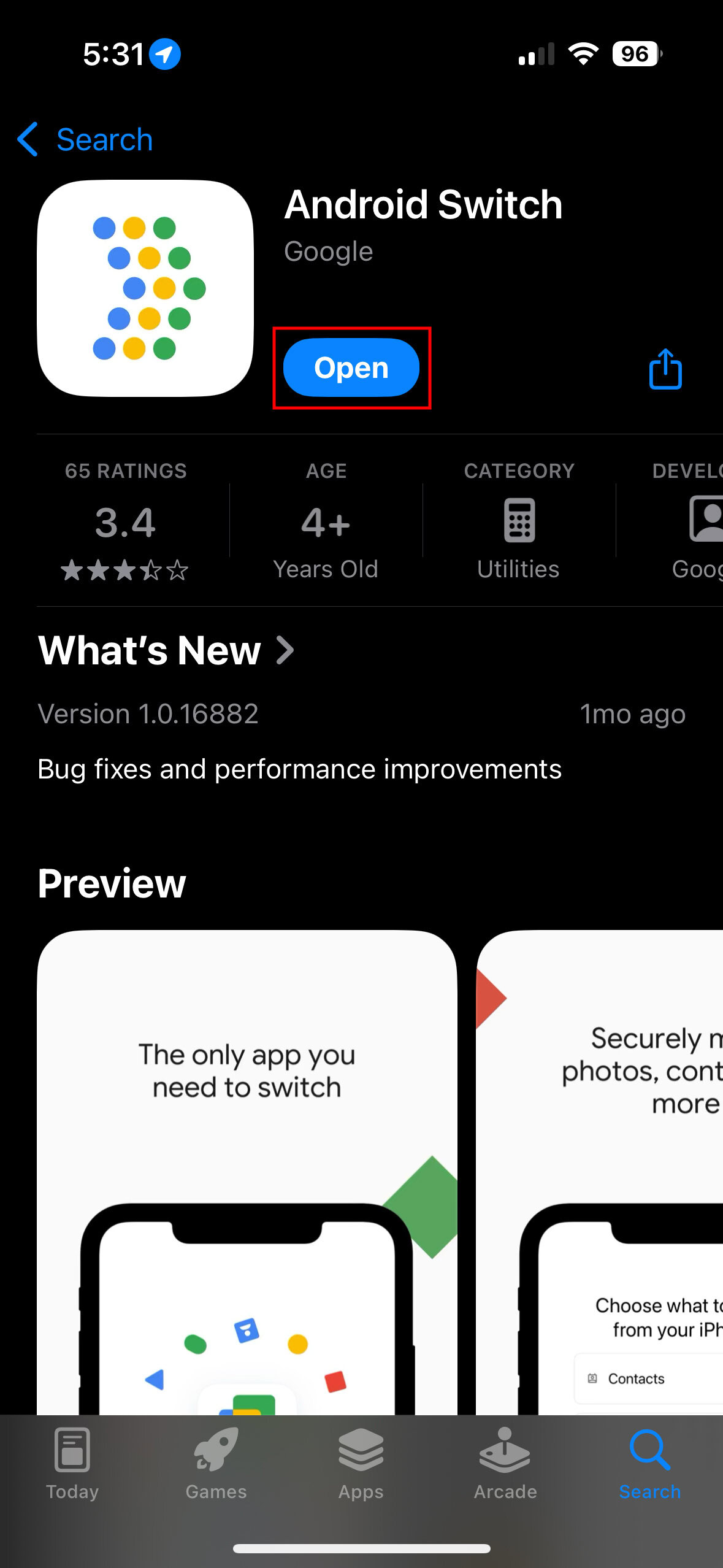 - On your iPhone, launch the Apple App Store and download Android Switch.