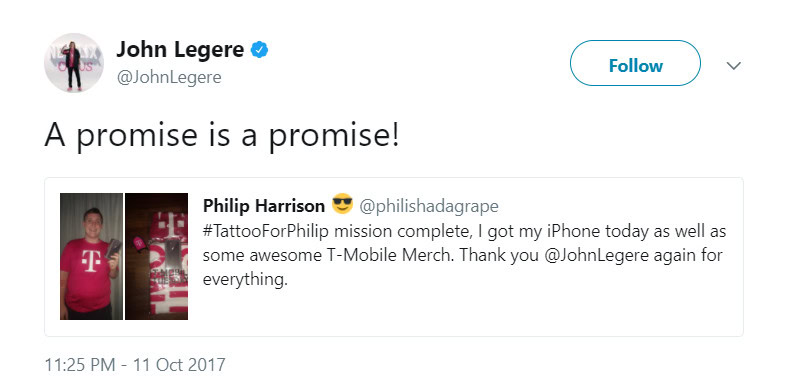 Back on October 8, Mr. Harrison took to Twitter to make a request of T-Mobile CEO John Legere. It was pretty simple: hook me up with a free iPhone 8 and I’ll tattoo the T-Mobile logo on my arm. Mr. Legere is known for his social media prowess and unorthodox behavior so of course he agreed. Mr. Phillips got the tattoo, posted proof and by October 11 had his free iPhone 8 (along with some other swag) in hand.
