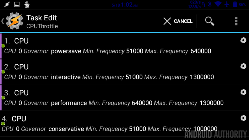 Most Kernels support a handful of CPU powering settings, Tasker will walk you through a half dozen or so, ranging from battery saver up to performance modes. Let me explain these in general terms, save the actual technical info for another day. Each setting controls how active the cores of your CPU are, and when they go to sleep – Performance mode generally keeps the cores up and active at all times while Battery Saver puts as many to sleep as possible and nearly refuses to wake them until it absolutely must.