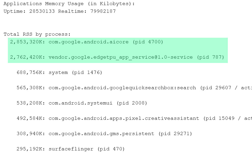 Instead, the slightly smaller edgeTPU service — which manages the Tensor G4’s AI hardware — appears to be locking out the RAM, as the service fits almost exactly into the extra reserved space on the Pro models. My best guess is that the two are mostly mapped to the same address space, with AICore placing its model and user data into RAM space accessible by the TPU service, allowing Google’s AI processor to perform computations without duplicating memory. This would explain their similar memory footprint, yet just under 3GB of reserved RAM in total. Either way, these services appear to be two sides of the same coin: AICore handles user data, and EdgeTPU the hardware.